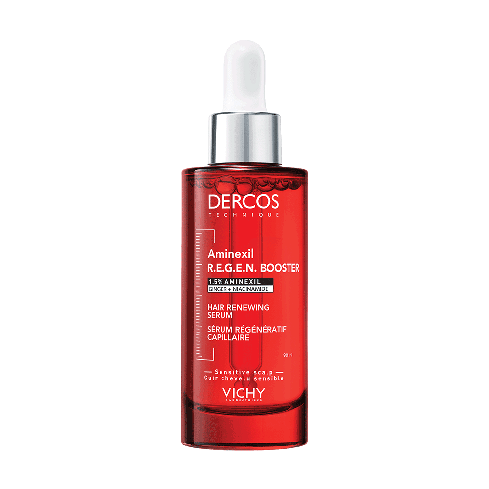 STEP 3: DERCOS Aminexil Pro 5 serum has a light, non-greasy, non-sticky texture. Each ampoule also contains both Aminexil and niacinamide. It's scientifically proven to reduce hair loss by 29%, increase resilience of and rebalance the scalp.[4]