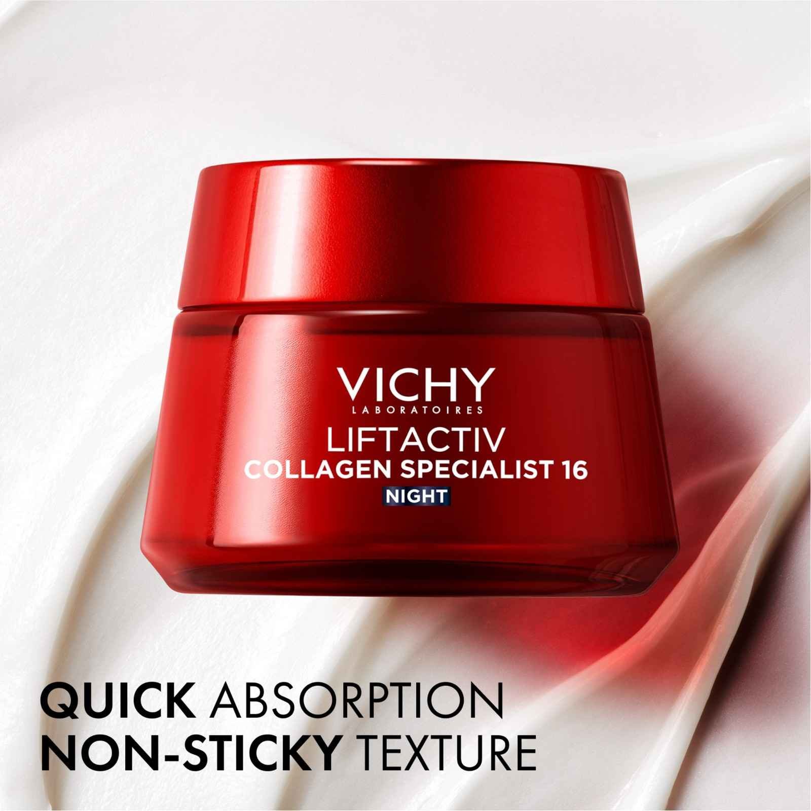 Liftactiv Collagen Specialist 16 Night Cream is a powerful peptide night cream by Vichy designed to target visible ageing signs linked to collagen loss¹. This advanced formula helps skin look plumped, firmer and revitalised each morning. Powered by Exclusive Co‑Bond Technology, with other scientifically proven ingredients, such as Niacinamide, Adenosine, Carnosine and Rhamnose, this night cream works to visibly correct 16 ageing signs², including wrinkles and fine lines, firmness, plumpness, sagginess, smoothness, skin texture, tonicity, skin strength, pores tightening, radiance, softness, suppleness, hydration, vitality, skin stretchiness and evenness.